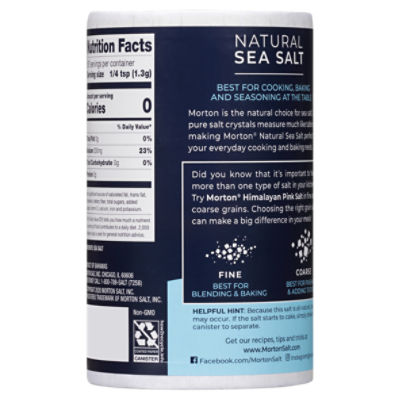 Nutrition Label - Allergen Inside Morton Mediterranean Sea Salt Fine Morton Mediterranean Sea Salt Fine, UPC Code 024600011983 Manufactured by Morton Salt, Inc. Allergen Inside Helping You Shop & Eat Safer. Home; Membership Plans; Allergy Tools . ... Nutrition Label. Nutrition Facts. Amount Per Serving % Daily Value*