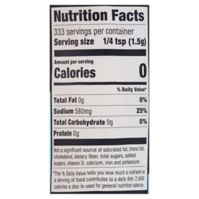 Nutrition Label - Allergen Inside Nutrition Label Nutrition Facts Serving Size 0.25 tsp Amount Per Serving Calories 0 Calories from Fat 0 % Daily Value* Total Fat 0g 0% Sodium 0.35g 14.58% Total Carbohydrates 0g 0% Protein 0g Vitamin A 0% Vitamin C 0% Calcium 0% Iron 0% *Percentage Daily Values are based on a 2,000 calorie diet.
