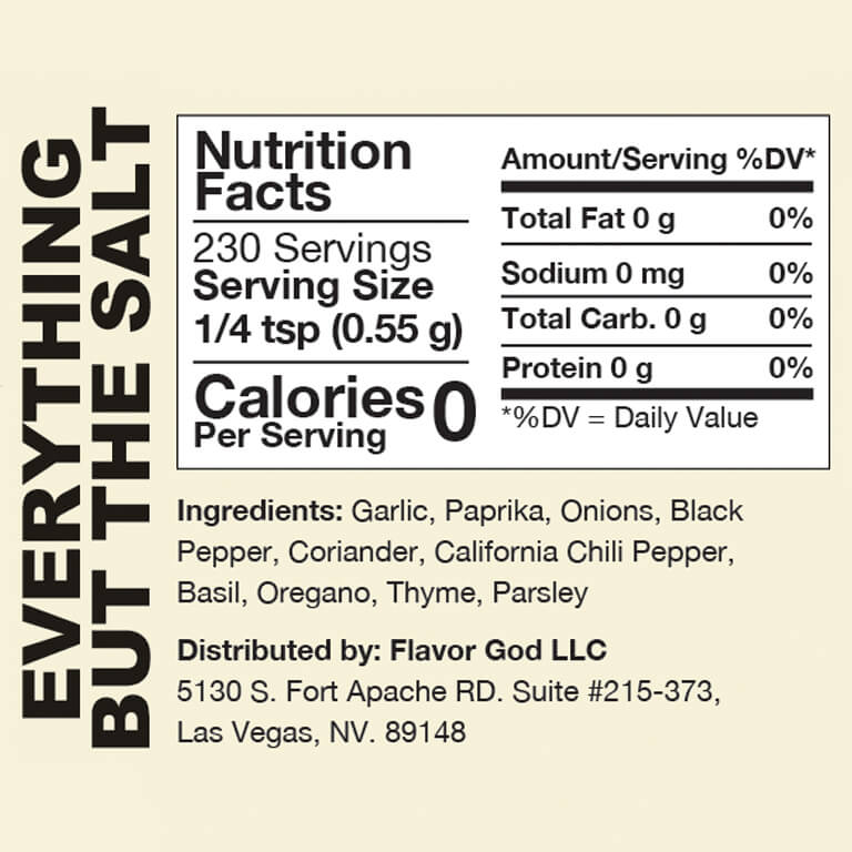 Flavor God - Everything But The Salt calories, carbs & nutrition facts ... Track macros, calories, and more with MyFitnessPal. Join for free! Daily Goals. How does this food fit into your daily goals? Calorie Goal 2,000 cal. 0 / 2,000 cal left. Fitness Goals : Heart Healthy. Fat 67g--/ 67g left. ... Everything Seasoning. Flavor God.