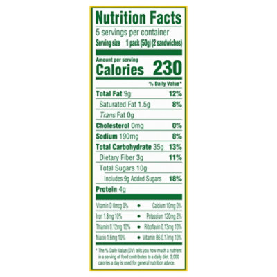 Nutrition Label - Allergen Inside Nutrition Label Nutrition Facts Serving Size 1.00 pack Amount Per Serving Calories 230 Calories from Fat 70 % Daily Value* Total Fat 8g 12.3% Saturated Fat 0.5g 2.5% Trans Fat 0g Cholesterol 0g 0% Sodium 0.21g 8.75% Potassium 0.085g 2.42% Total Carbohydrates 36g 12% Dietary Fiber 3g 12% Sugars 13g Protein 4g Vitamin A 0% Vitamin C 0% Calcium 0%