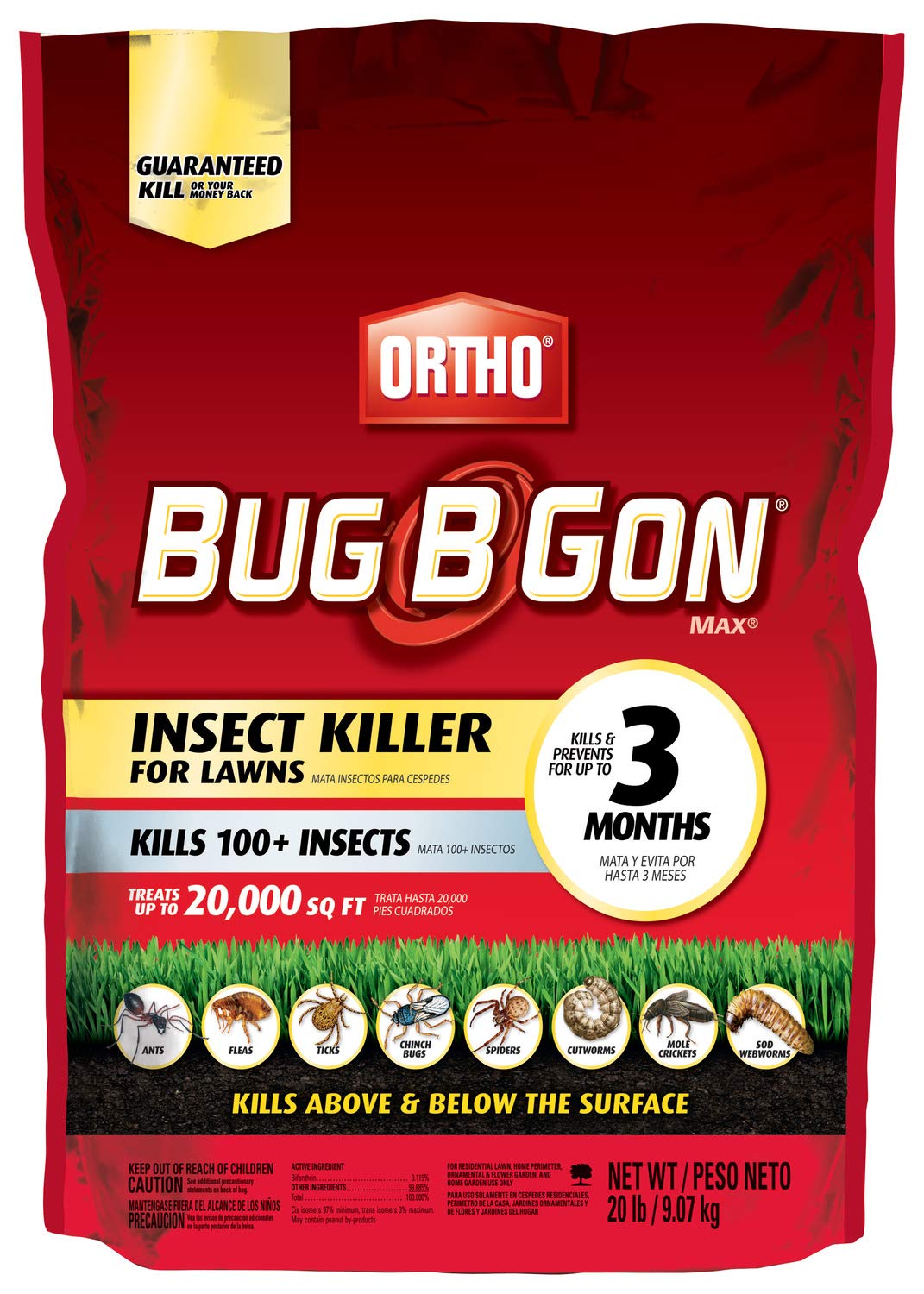 Amazon.com : Ortho 0167335 Bug B Gon Insect Killer For Lawns, 20-Pound ... Ortho Bug B Gon Max Insect Killer for Lawns (Kills 100+ Insects for 3 Months Including Ants, Chinch Bugs, Fleas, and Ticks) Ortho BugClear Lawn Insect Killer1: Treats up to 16,500 sq. ft., Protect Your Yard & Garden Against Ants, Spiders, Ticks, Armyworms, Fleas & Grubs, 10 lbs.