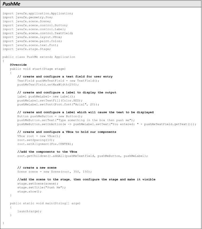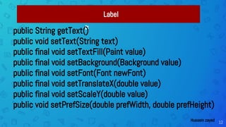JavaFX Button - Jenkov.com Dec 09, 2020 · Here is an example how how calling setText() on a JavaFX Button looks: ... Here is a JavaFX label example that adds an image to the button using an JavaFX ImageView ... Label (JavaFX 8) - Oracle Label is a non-editable text control. A Label is useful for displaying text that is required to fit within a specific space, and thus may need to use an ellipsis or truncation to size the string to fit. ... Methods inherited from class javafx.scene.control.Labeled alignmentProperty, contentDisplayProperty, ... setGraphicTextGap, setLineSpacing ...