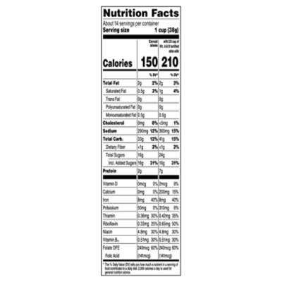 Nutrition Facts for Cap'n Crunch Cereal • MyFoodDiary® Cap'n Crunch Cereal Milk not included Nutrition Facts Serving Size cup 1 cup = 38g Amount Per Serving 150 Calories % Daily Value* 3% Total Fat 2g 3% Saturated Fat 0.5g Trans Fat 0g 0% Cholesterol 0mg 13% Sodium 290mg 11% Total Carbohydrate 33g 2% Dietary Fiber 0.5g Total Sugars 17g 34% Includes 17g Added Sugars Protein 2g 0% Vitamin D 0mcg