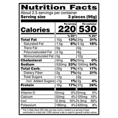 Beyond chicken by BEYOND MEAT nutrition facts and analysis. Beyond chicken by BEYOND MEAT contains 210 calories per 85 g serving. This serving contains 10 g of fat, 13 g of protein and 16 g of carbohydrate. The latter is 0 g sugar and 2 g of dietary fiber, the rest is complex carbohydrate.