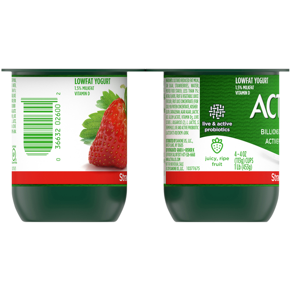 Activia® Strawberry Probiotic Yogurt Ingredients: Cultured Grade A Reduced Fat Milk, Cane Sugar, Strawberries, Water, Modified Food Starch, Contains Less than 1% of Milk Protein Concentrate, Kosher Gelatin, Agar Agar, Natural Flavors, Fruit Juice Concentrate, Fruit and Vegetable Juice (for Color), Carrageenan, Calcium Lactate, Lactic Acid, Milk Calcium, Vitamin D3. LIVE CULTURES L. BULGARICUS (2), L. LACTIS, S. THERMOPHILUS LIVE ...