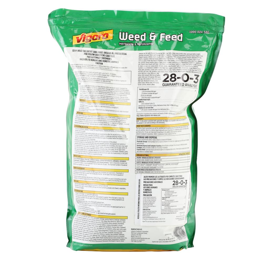 43.9 lbs. 15000 sq. ft. Weed and Feed Weed Killer Plus Lawn Fertilizer Vigoro Weed and Feed Fertilizer performs double duty. It treats tough weeds to the root and promotes lush green growth without burning. Vigoro Weed and Feed ...