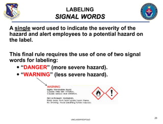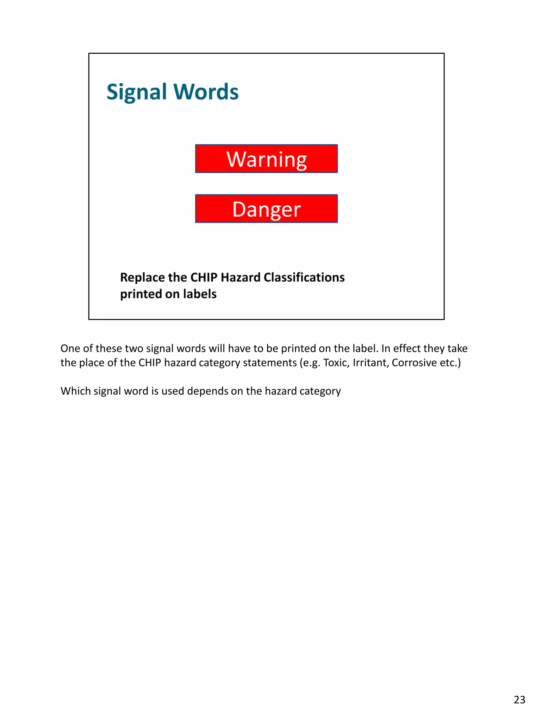 Hazard Communication Standard: Labels and Pictograms consistency in the classification and labeling ... including pictograms, signal words and hazard ... There are only two words used as signal words, “Danger” ...