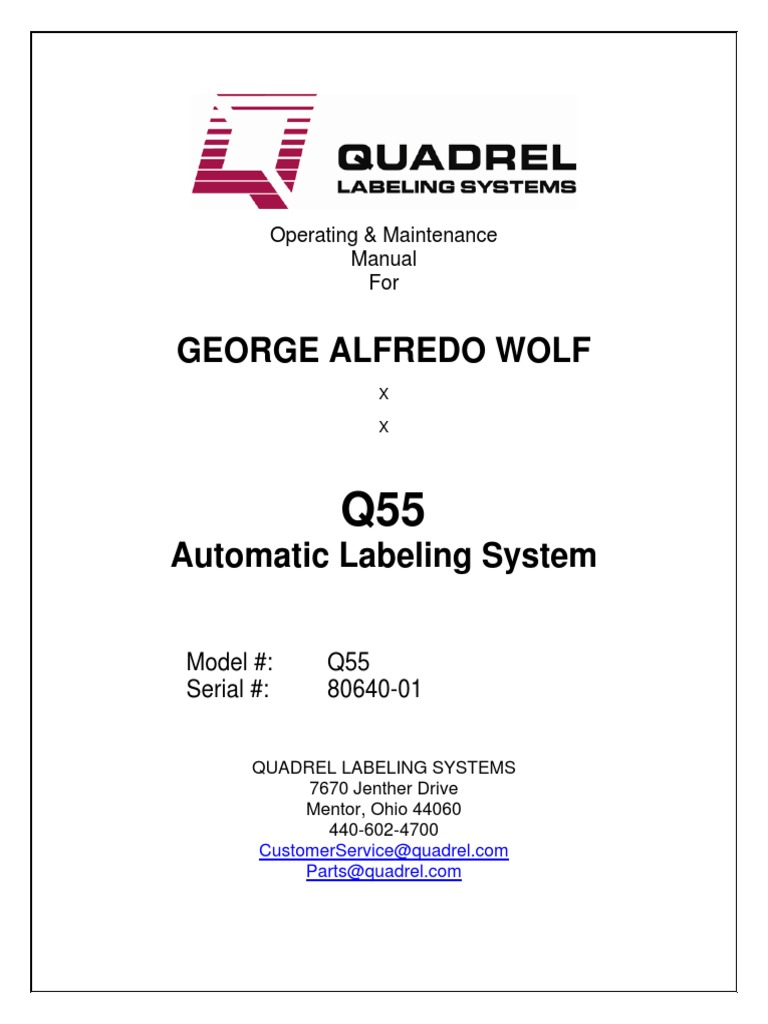Quadrel labeling systems manual. Quadrel Labeling Systems: Semi-automatic labeler Quadrel Labeling Systems: Semi-automatic labeler Using a product fixture to hold the container, the Model TL2 labeler from Quadrel Labeling Systems (Mentor, OH) can tamp up to 25 labels/min with ±1/32" accuracy, says maker. Jun 30, 2000 All Quadrel Labeling Systems catalogs and technical brochures Q55 Wipe On Applicator. 2 Pages. TL5 LARGE DIAMETER WRAP LABELING SYSTEM. 2 Pages. Q31 Compact. 2 Pages. Q33 RFID Ready. 1 Pages. VERSALINE (Cabinet-Based) in line labeling system. Quadrel Labeling Systems | Mentor OH - Facebook Quadrel Labeling Systems, Mentor, Ohio. 160 likes · 122 were here. Pressure Sensitive, Print & Apply and Shrink Sleeve Labeling Machine Manufacturer. Quadrel Labeling Systems | Packaging World Quadrel Labeling Systems is a world leader in the design and manufacture of pressure sensitive label application equipment as well as shrink sleeve labeling systems. We serve a wide variety of industries, including packagers of pharmaceuticals, personal care products, automotive chemicals, beverages and food.